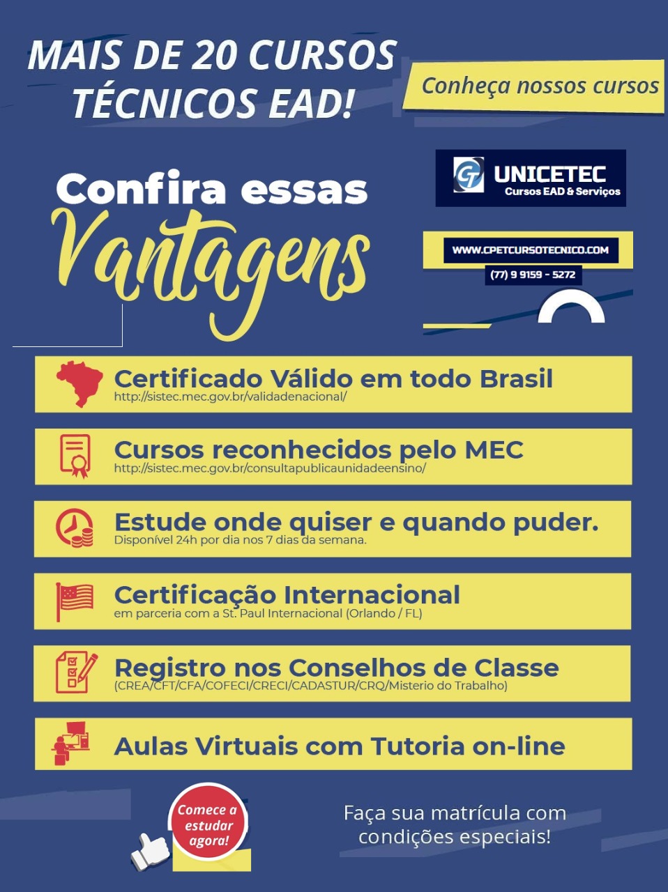 Os nossos cursos são realizados 100% Via Web os nossos Diplomas são iguais aos diplomas dos cursos Presenciais, não havendo citação de que foi realizado via web. As aulas são ministradas por experientes professores com muita prática no mercado de trabalho, de forma a que o aluno aprende muito mais. As aulas são realizadas de forma Via Web através...
